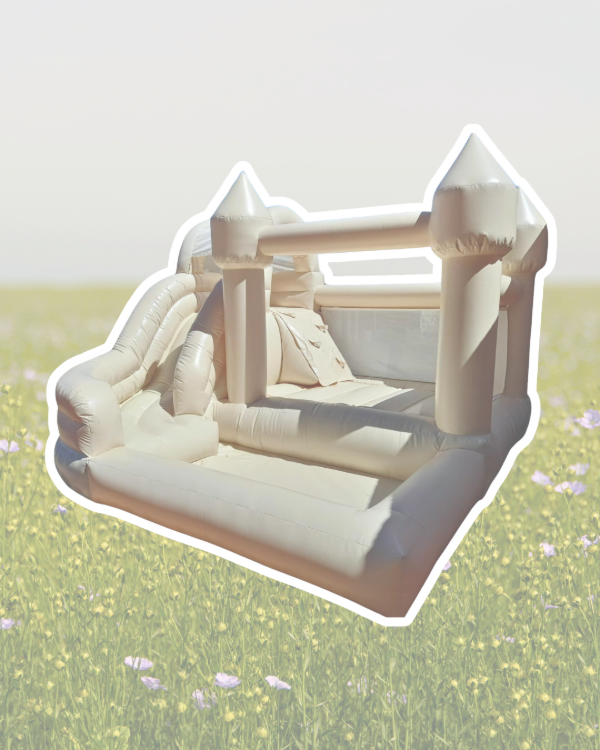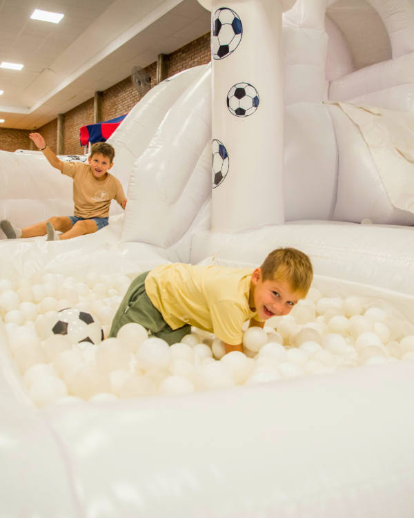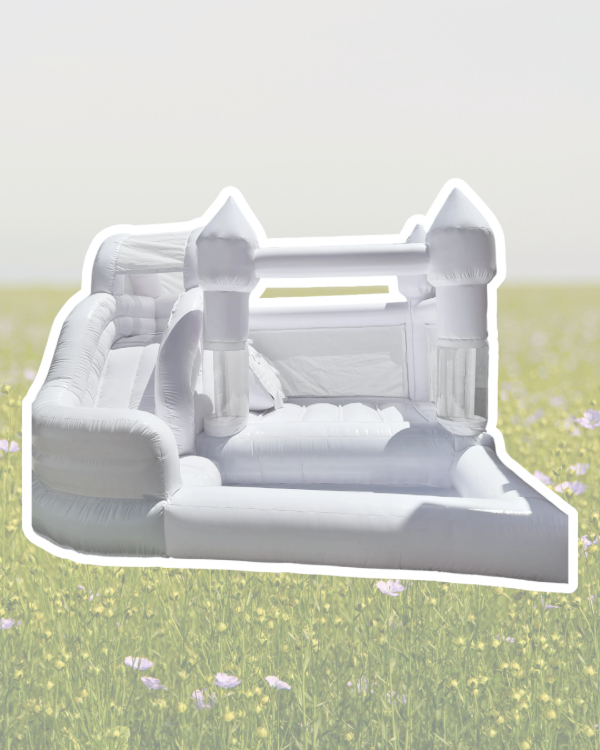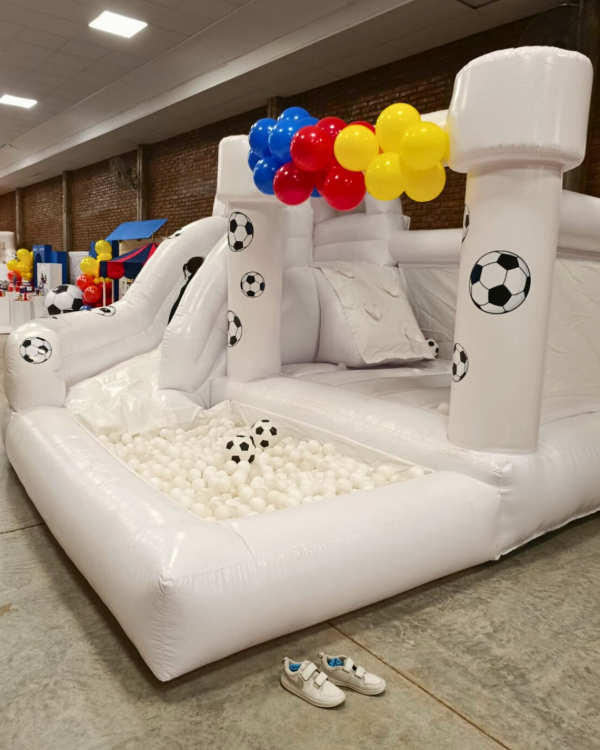 Un inflable de gran tamaño que combina tobogán y pelotero para una experiencia de juego completa.